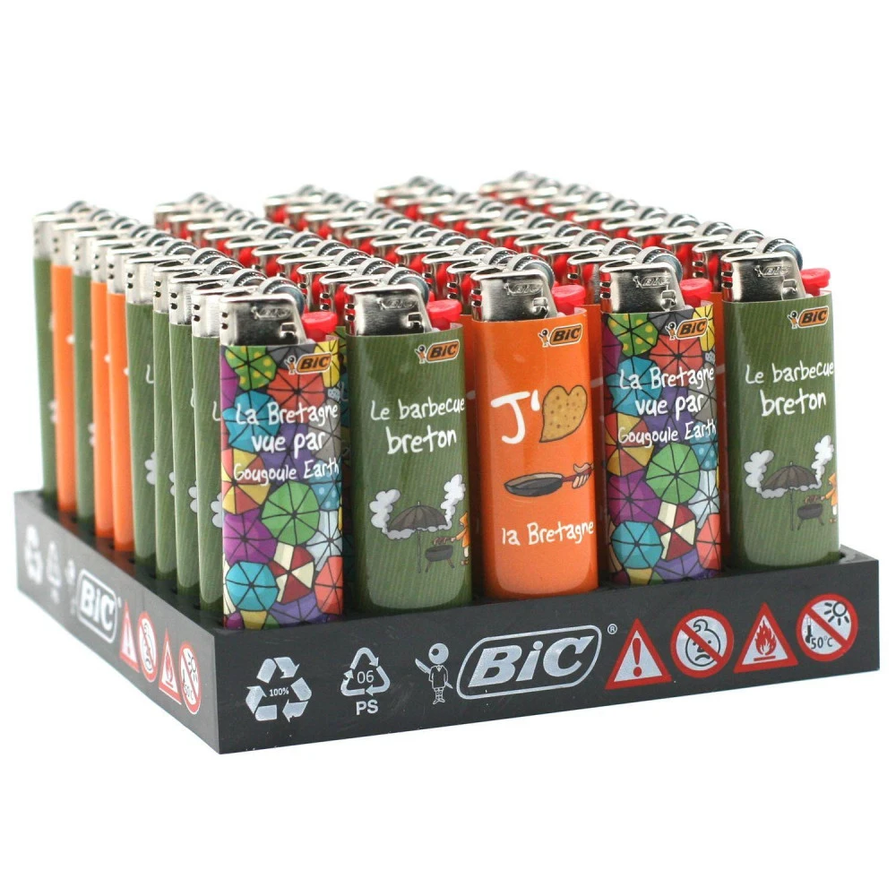 Plaquette complète avec 50 briquets BIC J26 (grand format) sur le thème de la Bretagne. Avec 5 modèles différents comprenant chacun une illustration humoristique sur la vie en Bretagne. Venez découvrir cette collection et ses illustrations aussi drôles que colorées !